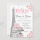Invitación de cumpleaños Paris Sweet 16 con una hermosa Torre Eiffel plateada, elegantes paquetes de regalo de París, zapatos de tacón alto con brillo plateado y elegante letra rosa de París sobre un fondo floral rosa intenso. Esta hermosa invitación de cumpleaños Paris Sweet Sixteen se personaliza fácilmente para su evento simplemente agregando sus datos en el estilo de letra y color, y redacción de su elección. Este es un diseño impreso sin diamantes reales, joyas, brillo, etc.