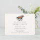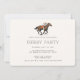 Invitación moderna para fiesta del Derby de caballos de carreras con una ilustración de un caballo de carreras con jockey y patrón de rayas en la parte posterior. Todos los elementos de texto se pueden cambiar para que este diseño se pueda utilizar para otros eventos también: invitación de boda ecuestre elegante, fiesta de cumpleaños de caballo, fiesta de observación del derby, inauguración de caballeriza y más. ¡El fondo, el color de la ilustración y los colores del texto se pueden cambiar utilizando la herramienta de diseño!