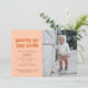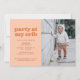 Esta divertida invitación a la fiesta de cumpleaños incluye las palabras "fiesta en mi cuna" en coral sobre un fondo color melocotón. Incluye espacio para una sola foto a la derecha con espacio para todos los detalles de su fiesta a la izquierda. En la parte trasera hay un color que coordina el coral y rayas de melocotón.