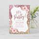 Faux rosa dorado brillante fondo purpurina y floral rosa rubor con el guión "vamos fiesta" en el centro, elegante y elegante, grandes invitaciones para fiesta de cumpleaños, fiesta de vacaciones, fiesta de compromiso u otras ocasiones especiales.