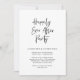 Hermoso Moderno Sencillo Casual Minimalista, Fuente Negra de Letra Cursiva, Anuncio de Boda y Huida, Tarjeta de Invitación (Fiesta Felices Para Siempre). Esto es perfecto para la recepción de su boda y la fiesta de celebración posterior a la boda. Agregue sus detalles en la misma fuente / letra.