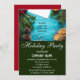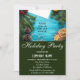 Invitación festiva anual de Navidades de empresa con ramas de árboles de Navidad, conos de pino y galletas de Navidad en madera azul claro con un fondo verde oscuro y marrón rojo. Esta rústica invitación campestre es perfecta para vacaciones / Navidades / fiestas de invierno!