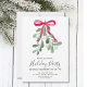 Invite a su familia y amigos a su fiesta de vacaciones con esta invitación festiva. Está decorado con mistletoe verde acuarela, cinta roja y tipografía de escritura elegante. Personalizable fácil. Acuarela original © Michele Davies.