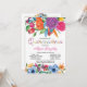 Invitación floral Quinceanera con flores de fiesta. Este diseño audaz y dramático tiene una abundancia de flores coloridas, escritura elegante y tipografía moderna sobre un fondo blanco. El ilustracion acuático está formado por peones, rosas, fucsia, lirios y vegetación en tonos rosa, violeta, naranja, amarillo, verde y azul. La plantilla está preparada para que usted añada detalles de la Ceremonia de la Iglesia y la Recepción. Por favor, navegue por nuestra tienda si necesita la invitación sin tener en cuenta la misa.