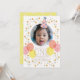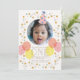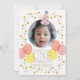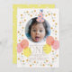 Esta tierna invitación a la fiesta de primer/primer cumpleaños muestra tu foto con un gorra fiesta en rosa y globos en rosa y amarillo. El reverso presenta un fondo amarillo claro con estampados triangulares y estrellas aleatorios. Personalice sus necesidades. Puedes encontrar más productos a juego en mi tienda.