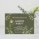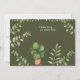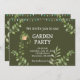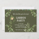 Una invitación con letras blancas en un fondo verde y muchas plantas verdes y líneas de bandera. Destinado a un fiesta de jardín en verano. Totalmente personalizable en ambos lados.