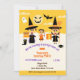 Celebra el segundo cumpleaños de tu hijo pequeño con esta invitación geométrica y moderna, en la que aparece el niño de cumpleaños con su madre y su padre celebrando la noche de Halloween. La tarta de cumpleaños está lista. ¡Madre y padre están todos vestidos, y es el niño! Un regalo está esperando ser abierto y un pastel de cumpleaños está listo para ser comido. Fantasmas y murciélagos, gatos y arañas se unieron al fiesta. El fondo de esta invitación a la fiesta de cumpleaños de Halloween incluye puntos coloridos que parecen confeti festivo y un sol sonriente brillante. Es muy fácil personalizar esta simple pero adorable invitación de fiesta de cumpleaños con tus propios detalles.