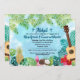Elementos de una divertida fiesta hawaiana luau representados con efecto de acuarela aparecen en esta invitación que encajaría perfectamente en una celebración isleña. Hojas y flores tropicales rodean el borde de la invitación contra un suave cielo azul. Una piña, cocos y un ukelele están esparcidos entre el follaje. Úsala para cualquier celebración luau, incluyendo una despedida de soltera o de soltero, celebración de boda sin ceremonia, fiesta de cumpleaños, fiesta de soltero o simplemente cualquier reunión con tema de playa o isla. Disponible con productos a juego.
