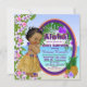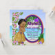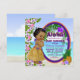 Invitación de luau para baby shower con una adorable bebé afroamericana con falda de hula de hierba en una colorida playa tropical. Puedes personalizar fácilmente esta adorable invitación de baby shower hawaiana tropical luau para tu evento simplemente agregando tus detalles en el estilo de fuente y color que elijas. Algunos gráficos ©delightfuldoodles.