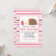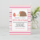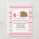 Una encantadora invitación para una fiesta de cumpleaños con un fondo de rayas rosas, en la que aparece un erizo con un gorra fiesta y un quequito de fresa.