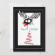 Invitación del partido de los navidades. Un ilustracion peculiar de un reno negro y blanco navidad, con una nariz roja brillante. Rompiendo su camino a través de un papel envolvente, luciendo loco y desconcertado. Personalizar con los datos de su fiesta.