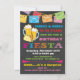 ¡Fiesta de cumpleaños de las cervezas y los vítores! Fiesta Mexicana divertida y colorida celebración del cumpleaños con pancartas de papel picado, una Margarita, cerveza, tacos y fuentes divertidas en un oscuro fondo de pizarra. ¡Ideal para un fiesta adulto con temática española o mexicana! Ilustracion dibujado a mano por McBooboos