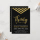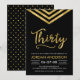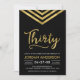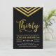 Invitación de cumpleaños número 30 moderna con un elegante chevron geométrico y la palabra "Treinta" en falso oro sobre un fondo negro. La tarjeta incluye un reverso con un patrón coincidente. Echa un vistazo a los artículos coincidentes aquí http://www.zazzle.com/collections/modern_faux_gold_chevron_celebration_collection-119531050277382712?rf=238364477188679314