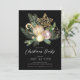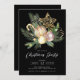 Esta elegante invitación a la fiesta de Navidades incluye una hermosa rama de pino, adornos de Navidades verdes y dorados y una estrella dorada sobre un fondo negro. La invitación es perfecta para invitar a sus amigos y familiares a una reunión festiva. El diseño general es festivo y refinado, y la invitación impresiona a los clientes.