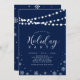 Celebra la temporada con esta moderna invitación de fiesta. Este diseño presenta elegantes luces de cuerda, copos de nieve y tipografía "FIESTA de Navidades" en azul marino y blanco. Se puede personalizar el texto y los colores de fondo. Un gran diseño para una moda Navidad moderno fiesta de vacaciones o fiesta de negocios de empresa.