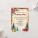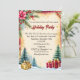 Árboles verdes y regalos envueltos en papel rojo y oro, con brotes de flores y siempre verdes en la parte superior, hacen que esta invitación a la fiesta de los Navidades sea colorida y festiva.