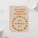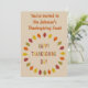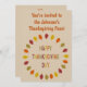 Esta impresionante invitación a la fiesta de Acción de Gracias muestra una imagen de arte digital de una serie de hojas de roble en tonos rojos, naranjas, amarillos y verdes dispuestas en un círculo alrededor de un texto con letras alternas de rojo, amarillo, naranja y verde que dice Feliz Día de Acción de Gracias. Hay texto de personalizable en la parte delantera y trasera para que puedas personalizar esta invitación.