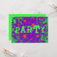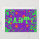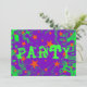 Invitación con un fondo violeta y verde agitado con estrellas naranjas mágicas y brillantes y la palabra "Fiesta" escrita en verde brillante. Un diseño de personalizable morado, verde y naranja para que añadas tu propio texto, imágenes e ideas. El texto puede cambiarse fácilmente utilizando la plantilla proporcionada o haciendo clic en el botón "Personalizar" para realizar más modificaciones. El sobre y el sello de franqueo coincidentes están disponibles. Creado mediante técnicas digitales por Jess Perry.