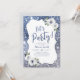 Falsos y brillantes purpurinas de plata y azul "vamos a fiesta" con polvorientas flores azules y blancas, elegantes y elegantes, grandes invitaciones para fiestas de cumpleaños, fiesta de vacaciones, fiesta de compromiso u otras ocasiones especiales.