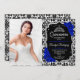 Invitación de fiesta de Quinceanera con tu foto. Presenta un patrón de damasco blanco negro, fuente de guión, rosas azules reales, tiara y confetti. Elegante diseño azul zafiro blanco negro con una falsa plata purpurina. Perfecto para una celebración elegante.