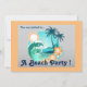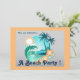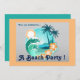 Invitación a una fiesta para un fiesta de playa con un estilo retro, un gráfico fresco de una puesta de sol y palmeras con un ambiente hawaiano en colores vivos y vivos de agua, naranja y azul. El texto de esta invitación es totalmente personalizable para incluir sus propios datos personales.