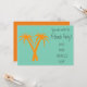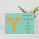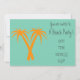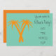 Una invitación a una fiesta para un fiesta de playa con un retro de moda, fresco gráfico de coloridos y brillantes palmeras naranjas con un ambiente hawaiano en colores vivos y brillantes de naranja y azul acuático claro. El texto de esta invitación es totalmente personalizable para incluir sus propios datos personales.