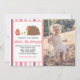 Una encantadora y personalizable invitación a la fiesta de cumpleaños de fotos con un fondo de rayas rosas, que incluye un erizo con un gorra fiesta con un quequito de fresa.