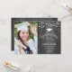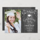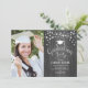 Invitación rústica a una fiesta de graduación con tu foto. Presenta un patrón de madera gris, luces de hadas de cuerda, tipo de letra de guión y un tapón de acero.
