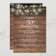 Con delicados corazones de amor dorados confeti y luces de cuerda bonitas en un fondo de paneles de madera rústicos. Personalice con la información de su fiesta sorpresa de aniversario dorado de cincuenta años en letra chic. Diseñado por Thisisnotme©
