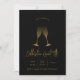 Tarjeta de invitación de celebración elegante en negro y dorado con dos copas de champán brillantes que chocan entre sí. El diseño combina un fondo negro elegante con texto y acentos dorados brillantes, creando una atmósfera lujosa y festiva perfecta para eventos, fiestas u ocasiones especiales de alta gama.