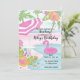 Dibujo adorable de acuarela de una piscina con un flotador de flamenco rosa, flores tropicales y palmeras. Úsalo para una fiesta de cumpleaños, despedida de soltera, fiesta en la piscina, reunión familiar o escapada tropical