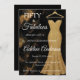 Fifty and Fabulous script minimal black, gold, white, marble, glitter modern 50th birthday invitation that you can personalize and send out for your fiftieth birthday party celebration. The words "Fifty and Fabulous" are set on a classy black and gold marble background, with popular white script font typography, placed aside an elegant, sophisticated gold glitter strapless evening gown. Have fun customizing the name, date and time, location, and RSVP with the editing tool.