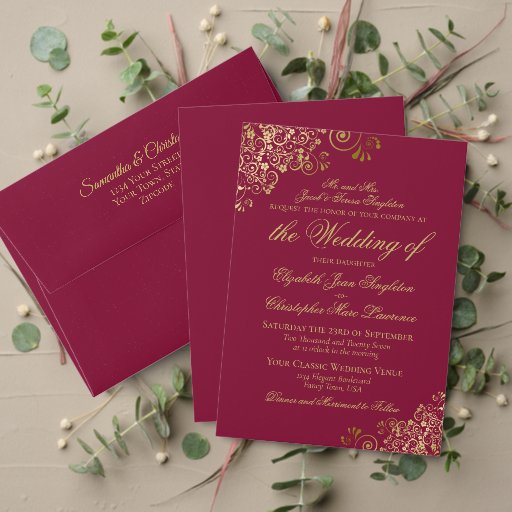 Invitación Filigree dorado en Borgoña Elegante Boda de código
