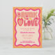 Celebre a la futura novia con estas invitaciones modernas y únicas. Esta invitación retro con temática "borracha de amor" en color naranja melocotón es personalizable con sus propios detalles. ¡Elija entre tenerlas impresas, recibirlas como descarga digital o ambas!