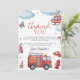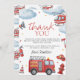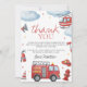 A cute firetruck-themed birthday thank you card featuring watercolor fire engines, firefighter gear, a rescue helicopter, and playful red-and-yellow accents. Perfect for thanking guests after a firefighter or fire station–themed birthday party. Fully customizable with your child's name and message. Ideal for printable or digital use.