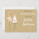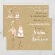 Un diseño boda divertido y elegante con un toque retro. Un par de flamencos de melocotón están a ambos lados de una torta casera con corazones de melocotón, confetti, anillos de oro y curvas contra un fondo de cambio de color marrón neutro. Un diseño de personalizable para que puedas personalizar con tu propio texto, imágenes e ideas. Imagen original de arte digital.