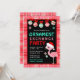 This cute and fun Christmas invitation features an adorable flamingo in a santa's hat on a pink and red plaid background. The text combines sans serif fonts for a stylish and modern look. Winter snowflakes and patterned baubles add a festive touch. This is perfect for a Christmas holiday ornament exchange swap party.