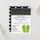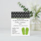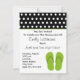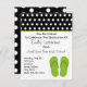 Invitación a una fiesta de cumpleaños con un borde negro con puntos de polka blancos en la parte superior con guarnecido verde. Ilustracion de un par de chanclas verdes en la parte inferior derecha. Personalice el texto negro con detalles de su ocasión. En el lado opuesto hay puntos blancos y negros. Busque etiquetas de correo y dirección coincidentes en el documento de Jill.