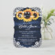 Hermosas invitaciones rústicas a la ducha con flores de girasol azul marino y girasol, con flores de girasol y encaje floral blanco en un ambiente rústico de madera. Elementos coincidentes disponibles.
