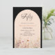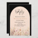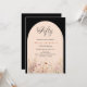 Una elegante invitación a la flor. Fondo negro y arco de color melocotón. Decorada con flores silvestres de color agua en tonos beige y rosa.