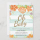 Dulces rayas color turquesa dibujadas a mano y flores naranjas modelo de tarjeta de invitación a la ducha para bebés. Diseño de encabezado Oh bebé con detalles a seguir debajo.