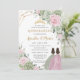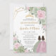 Esta invitación de la moda de Quinceañera tiene un marco geométrico de purpurina dorado adornado con delicados salchichas de color verde, florido rosa pálido, suave vegetación de salvia y un chica con un bonito vestido verde salado y otro chica vestido con un vestido rosa bonito. Personalízalo con tus detalles de forma fácil y rápida, simplemente pulsa el botón personalizar it para reorganizar y formatear el estilo y la ubicación del texto. ¡También genial para Sweet 16! c) El estudio Happy Cat Studio