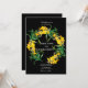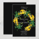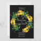 Una sencilla y elegante invitación a la boda hecha con flores silvestres en colores alegres y brillantes. La invitación incluye la formación de flores en forma de marco circular florido, con fondo negro.