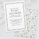 Colorida acuarela Botánica Elegante Invitación Baby Shower Flor Silvestre. Celebra que la madre sea con este diseño vibrante que combina con gusto la elegancia clásica con un toque moderno. En la parte delantera se muestra un texto negro refinado enmarcado por un borde de doble línea limpio, lo que crea un ambiente atemporal y contemporáneo. La tipografía presenta una mezcla de caligrafía manuscrita y una fuente serif clásica, añadiendo un toque de sofisticación. La parte trasera está decorada con un delicado y colorido patrón de flores silvestres en tonos pastel de rosa, violeta, azul, verde y amarillo, que evoca la belleza y el frescor de la primavera y el verano. Este diseño animado y suave aporta un encanto botánico alegre a las invitaciones a la ducha de bebé. Perfecto para fiestas en el jardín, reuniones al aire libre caprichosas o celebraciones de primavera y verano, esta invitación ofrece una estética lúdica y refinada. Personalizable completo, puede ajustar los colores, fuentes y diseño para que coincidan con su estilo y tema único. Disponible como una invitación impresa o un archivo digital descargable, este diseño marca el tono para una celebración inolvidable en honor a la madre para que esté con una belleza vibrante y un toque minimalista.