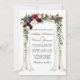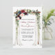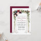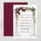 La elegante tarjeta de invitación a la boda floral Canopy Watercolor Borgoña Marsala incluye hermosos rosas burdeos, rosas rosas rosas, flores rojas y flores azules. El arco de madera boda con dosel incluye vegetación botánica.