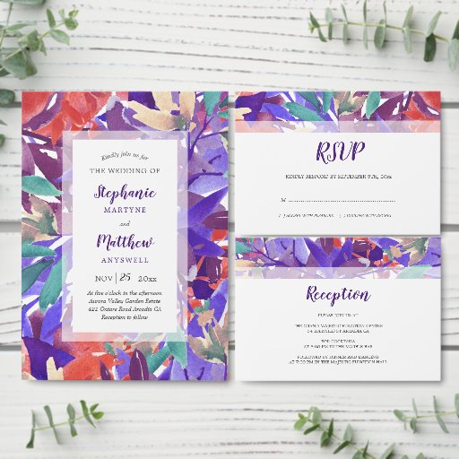 Watercolor Floral Foliage Coral Purple WeddingDiseñado por Gail K