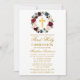 Elegante acuarela Floral Wreath First Holy Communion Invitation incluye rosas rosadas, rosas borgoñones, flores rojas, flores azules y vegetación. Cruz de Oro. Borgoña de vuelta.