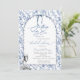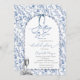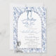 Esta elegante invitación incluye una encantadora reverencia azul, una copa de champán con rosas, perlas y flores azules, perfecta para una ducha de novia "algo azul". Los intrincados motivos florales y los suaves tonos azules susurran algo antiguo, algo nuevo y, por supuesto, algo azul. Estas invitaciones a la ducha de novias se personalizan fácilmente para tu evento simplemente añadiendo tus detalles.