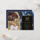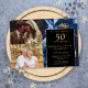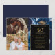 Esta elegante invitación de aniversario de bodas de 50 años con diseño floral azul negro y dorado se puede personalizar con su información en tipografía moderna y dos fotos especiales. Diseñado por Thisisnotme©