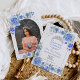 Bonito y elegante moda con un toque moderno a la tradicional Quinceañera con una corona tiara purpurina de plata, con un ramo de flores de bonito pintado a mano y flores de guiso azul botánico y azul celeste con confeti purpurina gris plateado y una moderna forma de arco purpurina, con una elegante tipografía de escritura por el cumpleaños de Quinceañera. Añade tu foto al fondo. perfecto fiesta de cumpleaños de Mis Quince con una corona de tiara, princesa de oro rosa.